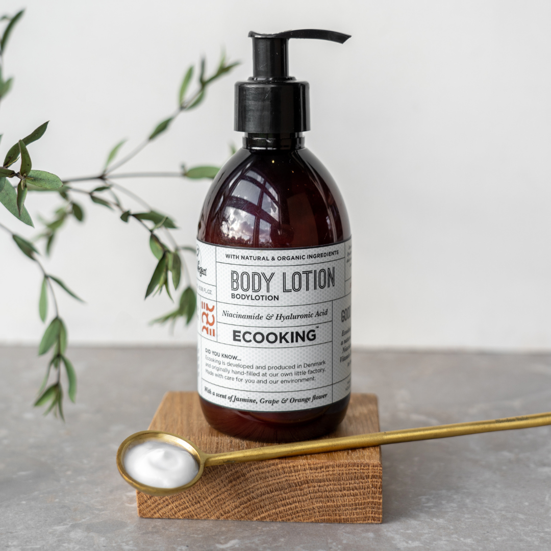 Ar jasmīna, vīnogu un apelsīna ziedu dabīgiem aromātiem. Aktīvās sastāvdaļas piešķir ādai elastību un mirdzumu, vienlaikus samazina celulītu vai ādas raupjumu, padarot ādu stingru. Turklāt tas viegli uzsūcas un neatstāj lipīgu slāni. Ķermeņa losjons satur efektīvu sastāvdaļu kokteili, piemēram: hialuronskābi, kas pazīstama arī kā HA, kas mitrina jūsu ādu un darbojas dziļākajos ādas slāņos; šādā veidā Jūs nodrošinat ādu ar hialuronskābi un kolagēnu, ko Mēs zaudējam ar vecumu. Unikāls ādas mitrinātājs, kas aizpilda smalkas līnijas un grumbas. Ar Ecooking Ķermeņa losjonu Mēs esam pārņēmuši filozofiju un sastāvdaļas no mērķtiecīgas sejas ādas kopšanas un izveidojām produktu, kuru jāuzklāj uz ķermeņa. Tādā veidā ķermenis saņems tādu pašu efektīvu kopšanu ar rezultātiem kā sejas āda. Aktīvās sastāvdaļas:
